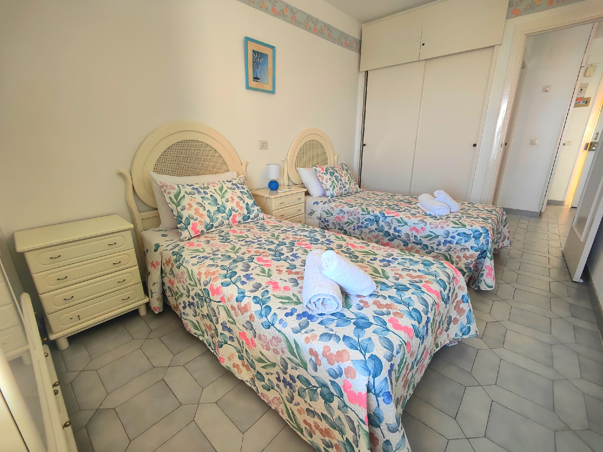 Air-conditioned bedroom with fitted wardrobes and 2 single beds.